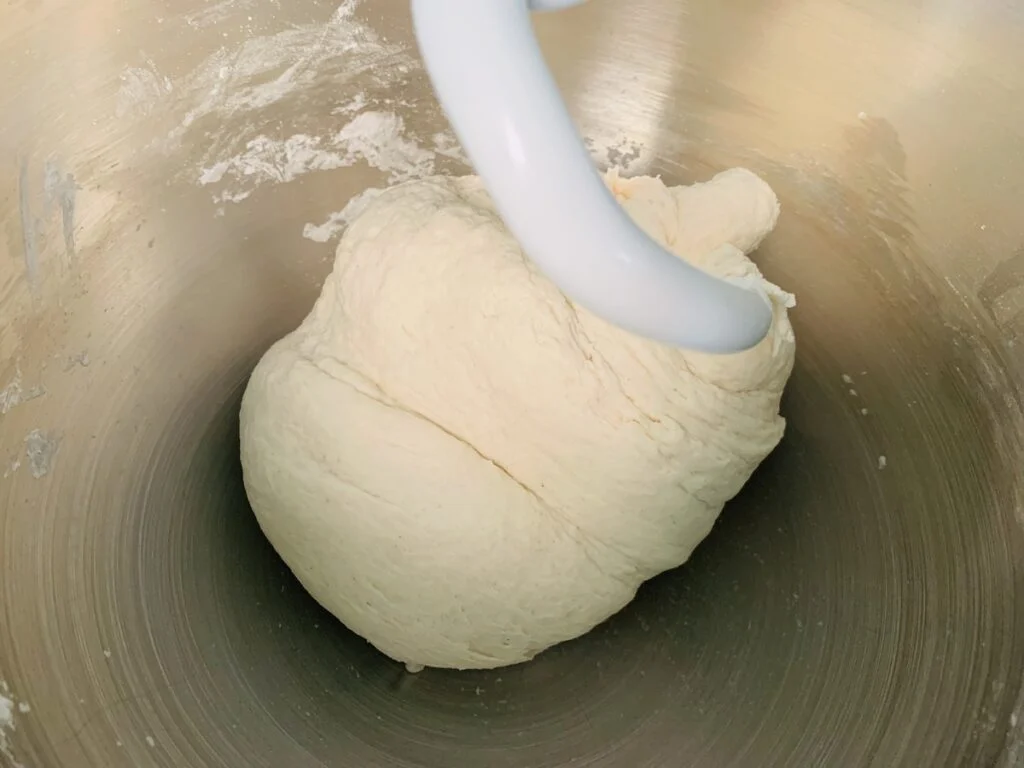 Use the dough hook and mix at #2 speed for five minutes. About one minute in, pause the mixer and scrape the sides and bottom of the mixing bowl to make sure all of the flour is incorporated into the dough. Then, continue mixing on #2 speed for the rest of the five minutes.