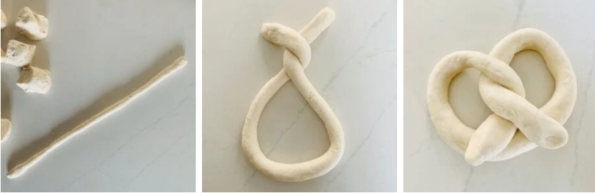 • Cut the dough into 12 roughly even pieces. Roll each piece of dough into a roughly 20-inch long rope. Form the rope into a U-shape, twist the ends together near the top, then bring the twisted ends towards the bottom of the U, and press them down to form a pretzel shape.