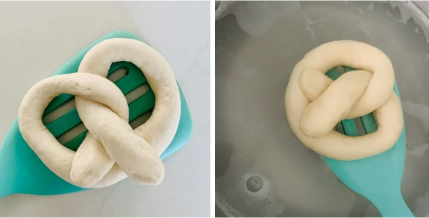 Using a slotted turner spatula, drop 1-2 pretzels at a time into the boiling water for 20-30 seconds. I like to make last-minute adjustments to the pretzel shape while on the spatula, just before placing it in the baking soda bath. While in the water, a firm dough forms on the exterior of the boiled pretzels, and the shape is set.