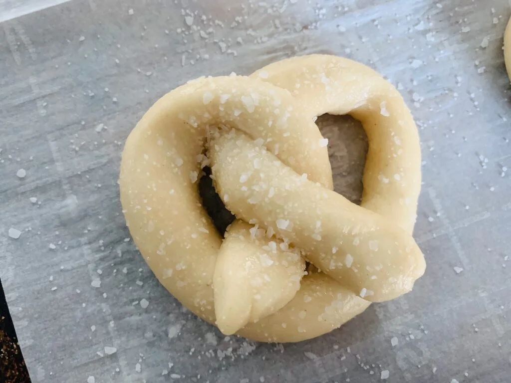 Place the pretzels onto the prepared baking sheets. Sprinkle coarse pretzel salt.