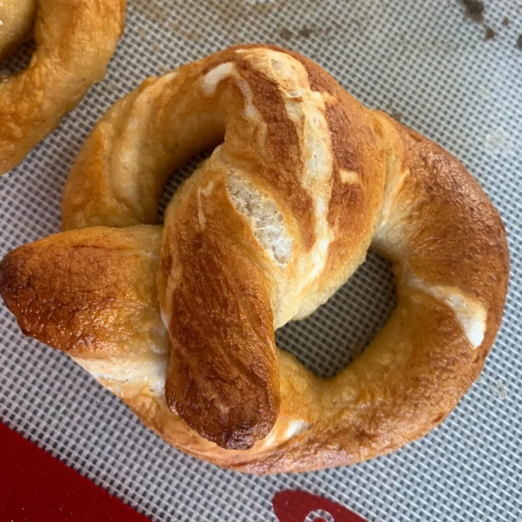 Tip! Wait for the outside to be deep brown. I tested this recipe multiple times to get it just right. I found that if the pretzels are removed from the oven too early, the inside will be slightly doughy, and they will deflate as they cool. If they bake until they reach the deep brown color of a traditional German pretzel, they stay soft and chewy.